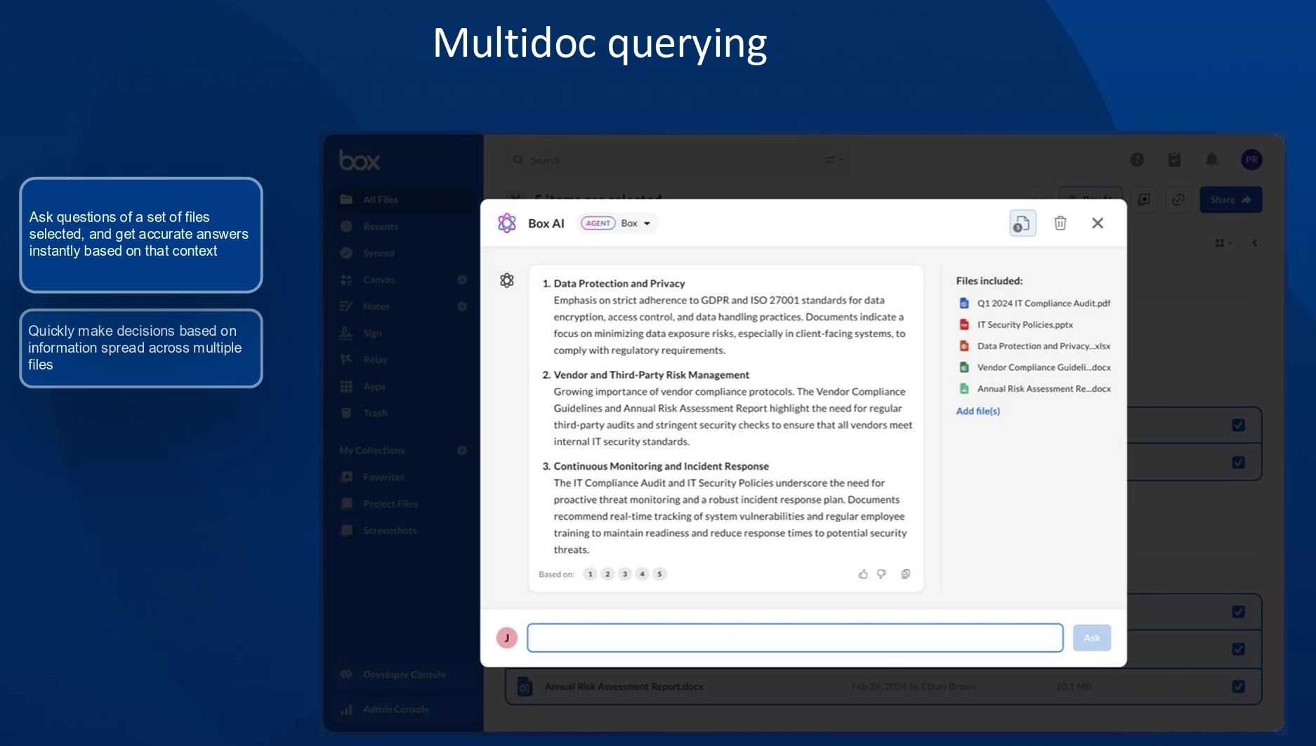 During the demonstration, Box AI’s multi-document query was talked about for content analysis. Users can query large volumes of documents at file, folder, or hub levels to unlock insights. For instance: