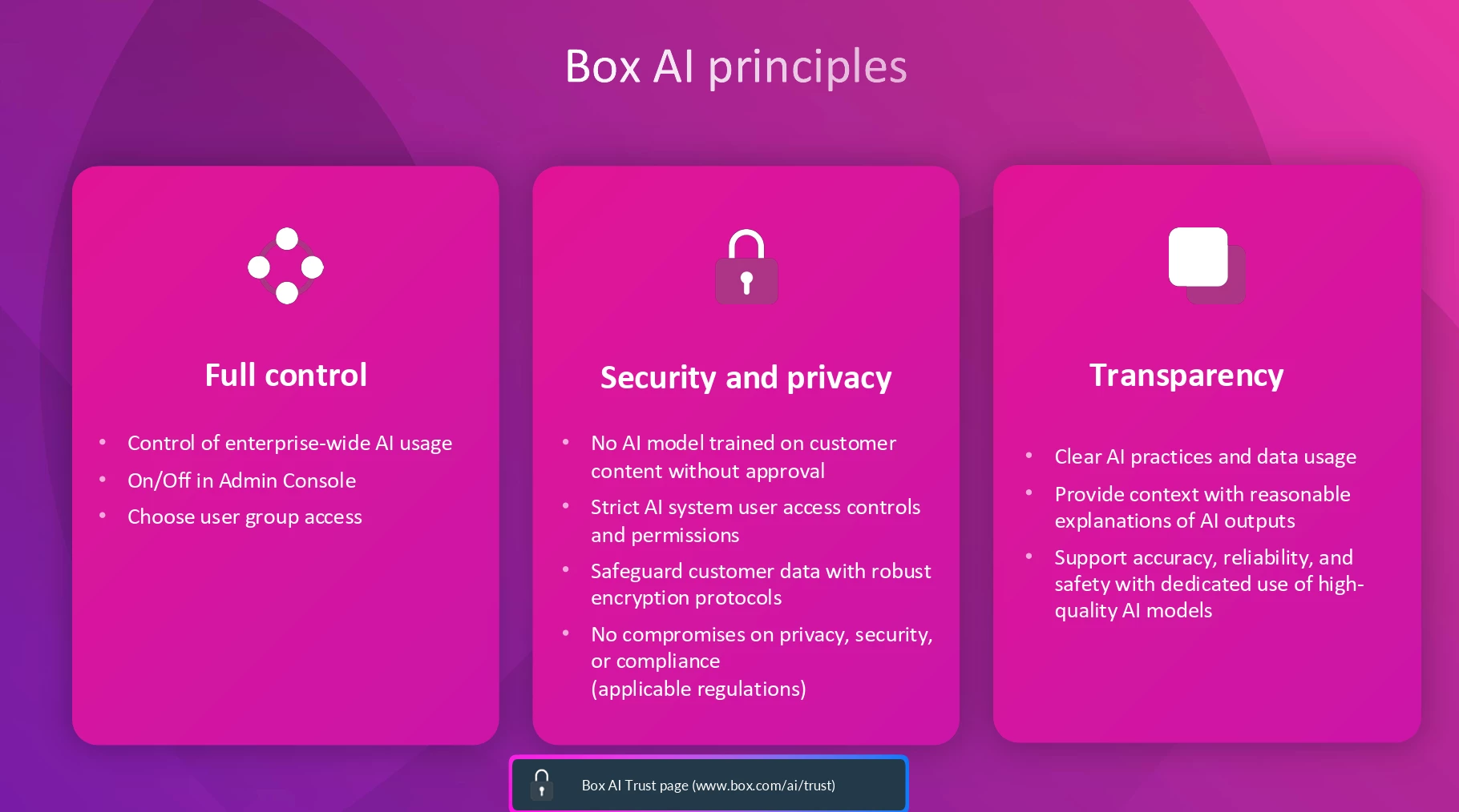One theme was Box’s commitment to ethical, secure, and transparent AI usage.
